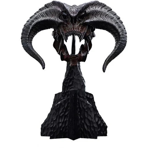 This specimen also possesses multiple sets of fanged outer dentition, complemented by dense rows of large molars, indicating a specialized design for both piercing and grinding. The robust jaw structure points to an immense biting force, maximizing its destructive potential. Each anatomical feature reveals a creature shaped for dominance, resilience, and a primordial bond with fire. Made of polystone, The Lord of the Rings Skull of a Balrog Miniature Statue measures approximately 8-inches tall.